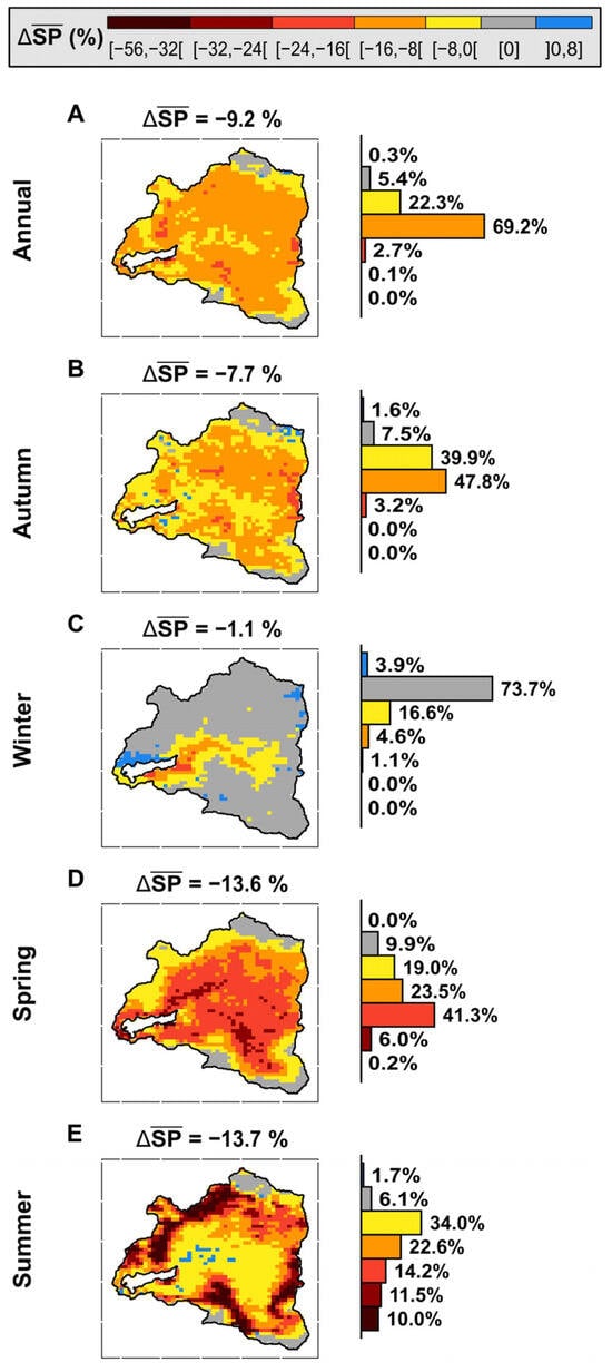 SP difference between the period pre-megadrought (2000–2009) and during the Mega Drought (2010–2021) in the YReB. Annually (A) in the first row and for each season from the second to fifth rows (B–E). The value above each graph represents the mean difference in SP between periods of the basin. To the right of each graph, there is a histogram that summarizes the percentage of the basin area used for ranges of . The close brackets ([]) denote that endpoints are included in the set, while open brackets (] [) indicate the exclusion of them.