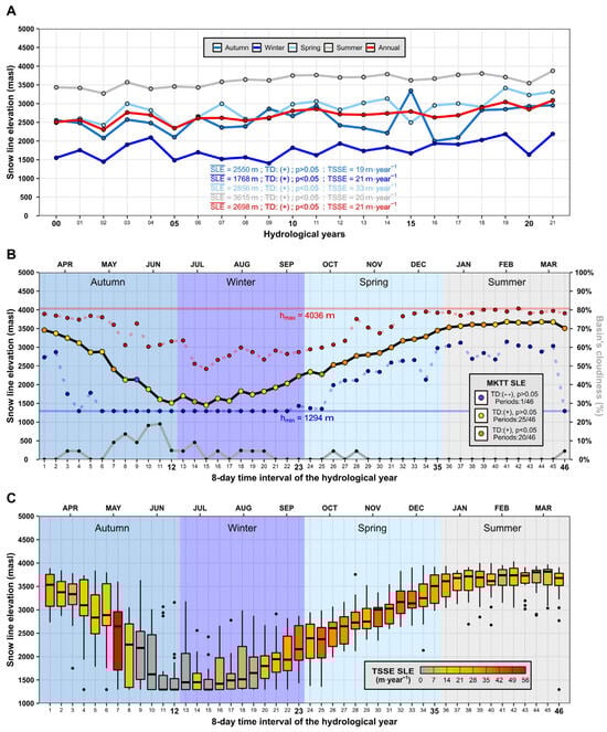 Snow line elevation evolution. (A) Seasonal and annual mean SLE time series, including the MKTT, TSSE, and mean. (B) Interannual variation in the 8-day historical mean SLE time series (solid black line). The color dot on the black line corresponds to MKTT. The dashed red (blue) line specifies the maximum (minimum) SLE per time scene. The solid red (blue) line corresponds to the maximum (minimum) value for the entire period (22 years). The grey line corresponds to the average basin’s cloudiness per time scene. (C) SLE Boxplots per time step. The color inside represents TSSE, and the black dots are outliers. The lower and upper hinges correspond to the first and third quartiles, while the center value corresponds to the median. The upper (lower) whisker extends from the hinge to the largest (smallest) value no further than 1.5 IQR (inter-quartile range).