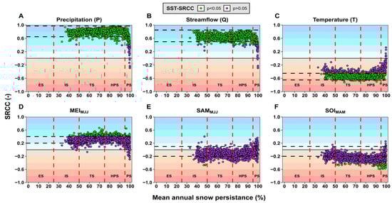 Correlation between mean annual SP at each grid point and annual hydrometeorological variables (large-scale climate indices). The first row displays SRCC between annual SP and hydrometeorological variables: (A) annual cumulative precipitation, (B) annual average streamflow, and (C) annual average temperature. The second row denotes SRCC between large-scale climatic indices: mean (D) MEI in MJJ (May to July), (E) SAM in MJJ, and (F) SOI in MAM (March to May). The fill color points in the graphs show the statistical significance test for SRCC (SST-SRCC), where green points denote significant SRCC at a 95% confidence level and purple the opposite.