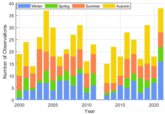 This study used L1-level satellite images of Landsat 5 TM and Landsat 8 OLI from 2000 to 2021 (bands are shown in Table 1). The data were downloaded from the official website of the United States Geological Survey (USGS). In order to ensure the coverage of the PRE and the adjacent Hong Kong region, we selected the images with the path/row numbers 122/044, 122/045, 121/044, and 121/045 and screened the images with less than 30% cloud coverage out. Finally, 292 Landsat 5 TM images and 217 Landsat 8 OLI images were retained. As shown in Figure 2, the seasonal distribution of remote sensing images shows that the number of images in autumn is greater than that in summer, and the number of images in winter is greater than that in spring, and the number of images in spring is only half of that in other seasons. The atmospheric correction of all the images was performed by ACOLITE (Generic Version 20220222.0). ACOLITE was developed by the Royal Belgian Institute of Natural Sciences (RBINS) and can output a series of parameters calculated from water reflectance [37]. In this study, non-water pixels were masked during atmospheric correction, other parameters were kept at default settings, and remote sensing reflectance (Rrs) was output.