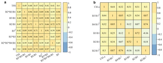 Pearson’s R coefficient of each selected band (a): TSS, (b): Chl-a.