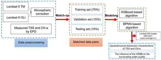 Figure 5 shows the flowchart for data processing. In summary, in this study, the Landsat 5/8 images were atmospherically corrected, and the Rrs was matched with the TSS and Chl-a data from the EPD to obtain matched data pairs, which were then divided into training set, validation set, and testing set and used to develop two algorithms based on the XGBoost and the BPNN. The better performing of the two algorithms was used to investigate the spatial and temporal distribution characteristics of TSS and Chl-a in the PRE and the impact of the HZMB on the water quality of its surrounding waters from 2000 to 2021.