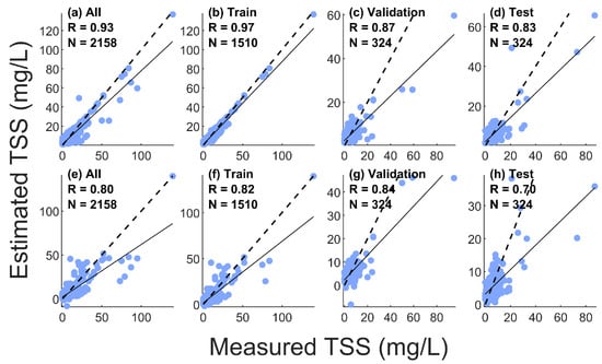 Correlation between estimates and in situ concentration of TSS ((a–d) for XGBoost-based algorithm, (e–h) for BPNN-based algorithm, black dotted line for 1:1, black solid line for fitting line).