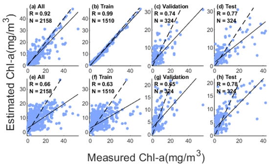 Correlation between estimates and in situ concentration of Chl-a ((a–d) for XGBoost-based algorithm, (e–h) for BPNN-based algorithm, black dotted line for 1:1, black solid line for fitting line).