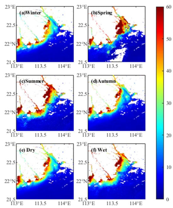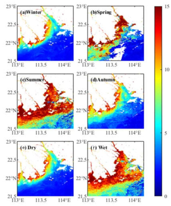 The average of TSS and Chl-a in each season, dry season, and wet season in the PRE are shown in Figure 10 and Figure 11 (the dry season is from October to March of the following year, and the wet season is from April to September). The spatial distribution of maximum and maximum concentration of TSS in each season is the same as that of the annual average concentration of TSS, and both decrease gradually from the estuary with the distance from the coastline. The TSS in spring and summer is evidently higher than that in autumn and winter, and the high TSS in spring and summer expands away from the shoreline, which is mainly influenced by the flow of the Pearl River. In spring and summer, a large sum of suspended sediment carried by the Pearl River is discharged from various estuaries, which expands the influence range of the high TSS, which can also be verified by the comparison between dry season and wet season. Chl-a also has different characteristics in different seasons and is higher in summer than in spring and higher in autumn than in winter. With the arrival of spring and summer, the upper sea temperature gradually increased, and the growth of phytoplankton accelerated [45]. Moreover, the water flow could spread the phytoplankton to further areas, making the high Chl-a distribution zone from the south of Modaomen to the north of Dandan Island, south of Hong Kong, more evident. The distribution of Chl-a in dry season and wet season also supports the influence of water flow in the estuary on this phenomenon.