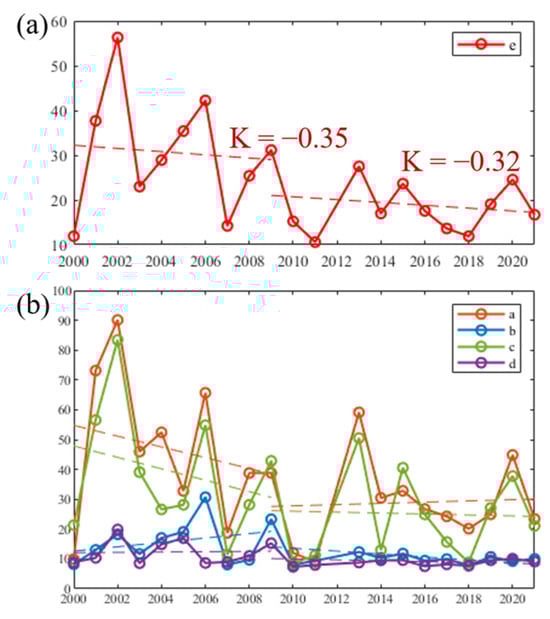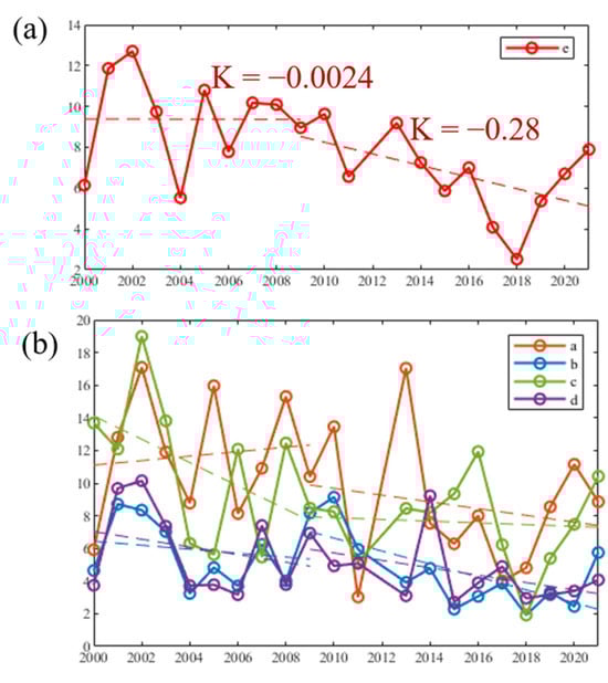 Figure 12 and Figure 13 show the changes in TSS and Chl-a concentrations in areas a-e from 2000 to 2021. For area e, which covers the whole HZMB, both TSS and Chl-a show a decreasing trend as a whole. As the erection of the HZMB officially commenced in December 2009, we divided the time into two time periods, 2000–2009 and 2009–2021. Since 2009, the decreasing trend in TSS is weakened with a rate of change greater than zero in region e, whereas the decreasing trend in Chl-a is enhanced with a rate of change less than zero. This may be due to the change in water quality within 7 km upstream and downstream of the bridge caused by the blockage of the bridge piers and artificial islands [46]. The increase in TSS may be accompanied by the decrease in water light, which will weaken the photosynthesis of phytoplankton. Meanwhile, as people attach importance to water quality, the control of sewage in this area is also an important influencing factor.