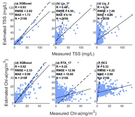 Comparison of different algorithms estimated and in situ measured TSS and Chl-a for all matched data pairs (a,d) XGBoost-based algorithm, (b,c) Liu et al.’s two algorithms, (e) RTA_17 algorithm, (f) OC2 algorithm.