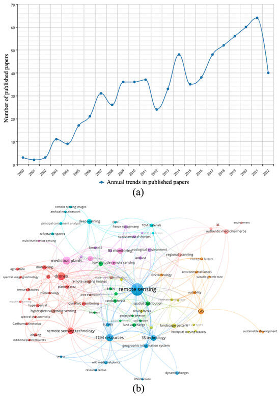 Remote sensing has the advantages of large coverage, high efficiency, timeliness, and labor reduction, providing timely and accurate farmland information for the agricultural sector. Compared with traditional survey methods, it has incomparable advantages and is increasingly used in agricultural production and management. As early as the 1960s, the Remote Sensing Agricultural Applications Laboratory at Purdue University in the United States was the first to use remote sensing data for crop planting area monitoring research, successfully monitoring a single corn crop and demonstrating the feasibility of satellite remote sensing data for crop monitoring [4]. In China, in 1979, Academician Chen Shupeng began to advocate using remote sensing technology for crop yield estimation. During Chian’s “Eighth Five-Year Plan” period, the remote sensing estimation of crop yield became a national science and technology task, and experimental research on remote sensing estimation of large-scale wheat, maize, and rice was conducted; as well as dynamic monitoring research on grass–cattle equilibrium in northern grasslands; monitoring and forecasting the planting area, growth, and yield of winter wheat in Hebei, Shandong, Henan, northern Anhui, Beijing, and Tianjin; rice in Hubei, Jiangsu, and Shanghai and corn in Jilin Province [5]. This indicates that remote sensing technology is continuously maturing in crop monitoring in China, and many experts and scholars have conducted research on remote sensing monitoring of medicinal plant resources, with some progress. Sun et al. [6] proposed the idea and method of applying remote sensing to the investigation of Chinese medicinal materials resources. Sun et al. [7] studied the remote sensing monitoring methods of medicinal plant resources in different ecological environments, and, respectively, expounded the monitoring methods of wild and cultivated medicinal plant resources, providing ideas and methods for remote sensing monitoring of different types of medicinal plants. Sun et al. [8] conducted the first survey and monitoring of wild Atractylodes lancea (Thunb.) DC. medicinal resources in China using remote sensing technology, showing the feasibility of using remote sensing technology for surveying and monitoring individual medicinal plants. With the development and progress of technology, remote sensing has been integrated with many disciplines, effectively realizing the estimation of wild CMP reserves [9], the CMP planting areas in artificial plantations, dynamic monitoring [7], etc. Remote sensing technology is indispensable in the real-time dynamic monitoring and sustainable development of CMPRs. However, due to the complexity of remote sensing data, diversity of classification methods, and sensitivity to scale, research on remote sensing identification and planting information extraction of CMPs has not been systematically sorted out, making it difficult to conduct universal research and wide-ranging applications. Figure 1 shows the trend of paper publication of remote sensing applied to CMP monitoring since 2000 (a) and keyword co-occurrence analysis.
