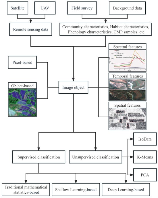Therefore, the planting patterns and habitat characteristics of CMPs are explored from the perspective of remote sensing application in this paper, providing references for data source selection, and the application of remote sensing in the identification and area extraction of CMPs is discussed. The identification and classification technology highlighted by remote sensing in the identification and area extraction of CMPs is emphasized in this paper, and the research progress of scholars is summarized and discussed, taking into account the classification scales, classification features, and classification methods. The issues and technical difficulties encountered in the research are also summarized and discussed. Then, the relevant research progress of CMP identification and information extraction is separately discussed in this paper according to different classification methods, and their advantages are compared and applicable objects described. Remote sensing data sources and classification methods can be preliminarily selected by researchers based on their own research content, methods, and objectives, combined with the types, planting patterns, and precision requirements of the CMP being studied, with reference to this paper. Finally, the key technical problems that still need to be solved in remote sensing identification and information extraction of CMPs are summarized based on previous literature reviews, and the future development direction of research is hypothesized, aiming at providing some references for further promoting remote sensing identification and information extraction research on CMPs.