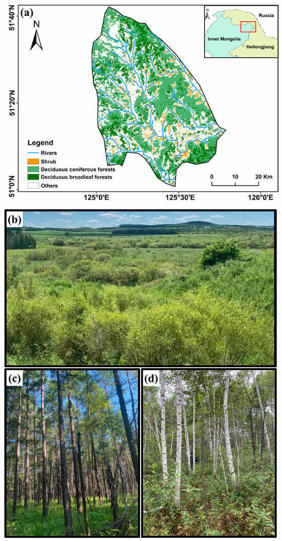 (a) Location of the Nanweng River National Nature Reserve and vegetation types (inset). Three types of vegetation (i.e., shrub, deciduous coniferous forests and deciduous broadleaf forests) obtained from the 2019 global land cover map (CGLS-LC100 Collection 3, with a spatial resolution of 100 m). (b) Photo of shrub at study area. (c) Photo of dominant species Larix gmelinii in the de-ciduous coniferous forest. (d) Photo of dominant species Betula platyphylla in the deciduous broadleaf forest.