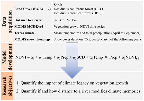 The overview of the methodology for this study is shown in Figure 2. We used the stochastic antecedent model (SAM) under a Bayesian framework [] to determine legacy effects of temperature, precipitation and snow cover duration on vegetation growth, using the EcoMem package [] in R []. The SAM approach allows us to estimate the effect and cumulative importance of current and antecedent climate on vegetation growth.