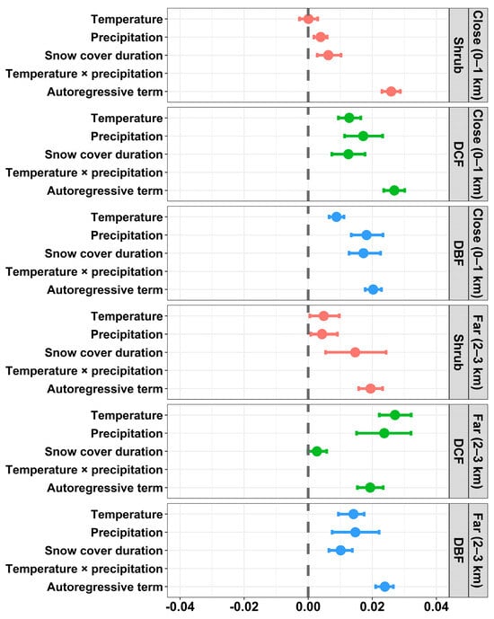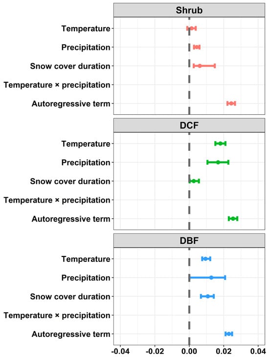 Posterior means values (points) and 95% credible intervals (CIs; horizontal lines) for antecedent climatic variables (i.e., temperature, precipitation and snow cover duration) and their interaction (temperature × precipitation) for three vegetation types (different colors represent different vegetation types, with red for shrub, green for deciduous coniferous forest (DCF), and blue for deciduous broadleaf forest (DBF)). The vertical dotted line indicates the zero line, and 95% CIs that overlap the zero line denote parameters that are not statistically different from zero.