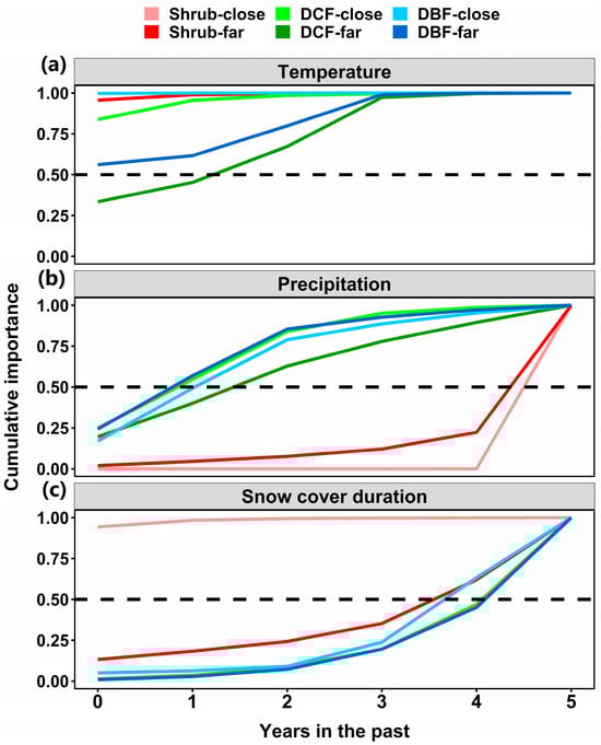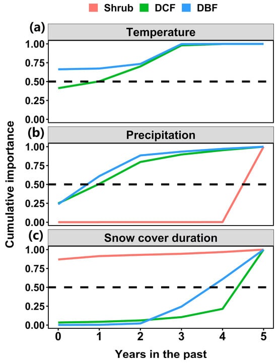 Cumulative importance of antecedent temperature (a), precipitation (b) and snow cover duration (c) on different vegetation types. Equivalent to ‘cumulative probabilities’, climate effects experienced over the concurrent year and past five years (x-axis) account for cumulative importance (y-axis) of the climate covariate to NDVI. The posterior mean cumulative importance is shown for each antecedent climatic variable, with different colored lines representing different vegetation types. Only vegetation types responding to climate variables in Figure 3 are included. The dashed line at a cumulative importance of 0.5 indicates the threshold for the critical lag period. The time when the cumulative importance crosses this line is considered the timescale of the memory effect for each vegetation type and for the climatic driver. DCF and DBF are deciduous coniferous forest and deciduous broadleaf forest, respectively.