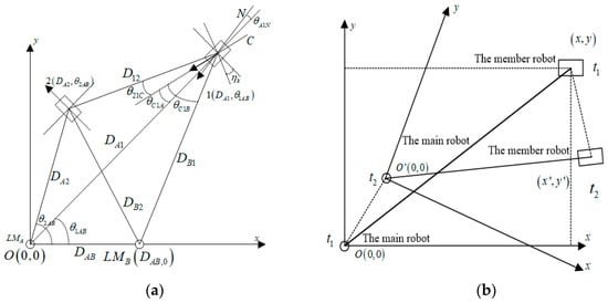 The elements in the global coordinate frames are described as follows, where 1 and 2 represent the main robot and member robots, respectively. LMA and LMB are artificial road signs. N indicates the main robot heading, and DAB is the camera optical axis centerline direction of the main robot. Hk is the angle between the main robot heading N and the camera’s optical axis centerline direction. The robot-equipped sensors provide the following data: D12, DA1, DB1, θ21C, θC1A, and θC1B. D12, DA1, and DB1 can be obtained from the laser range scanner, while θ21C, θC1A, and θC1B can be read by the vision sensors. DAB and ηK represent known observation data. Based on the geometric relationships before each robot and the road signs, the positions of the member robots in the global coordinate system can be solved for and expressed in polar coordinates as