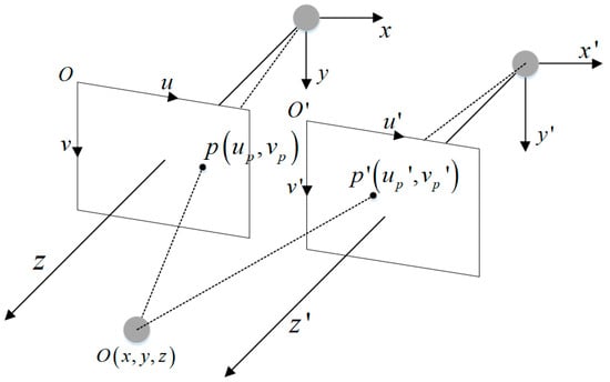 The binocular vision imaging model is shown in Figure 3; vou and v’ou are the image imaging plane, z and z′ are the central optical axis of the camera, p(up, vp) and p′(up′, vp′) are the target O in the two planes of the imaging point.