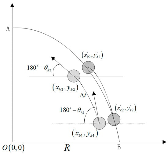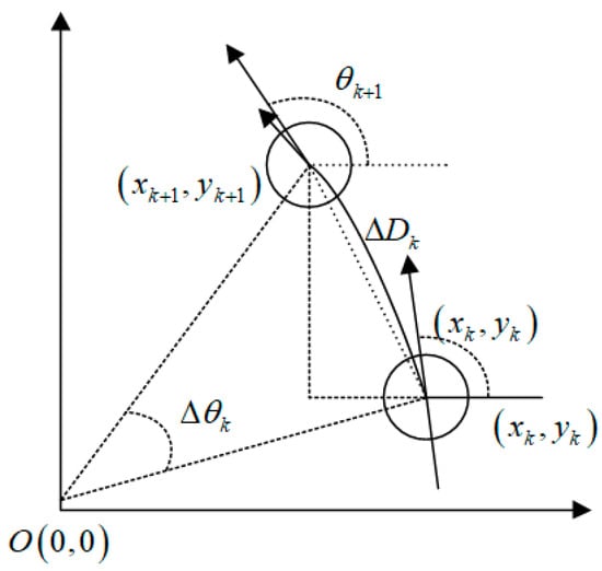 Combined with the motion characteristics of the robot, we use the arc model to describe the motion of heading changes; the corresponding state derivation model is shown in Figure 4.