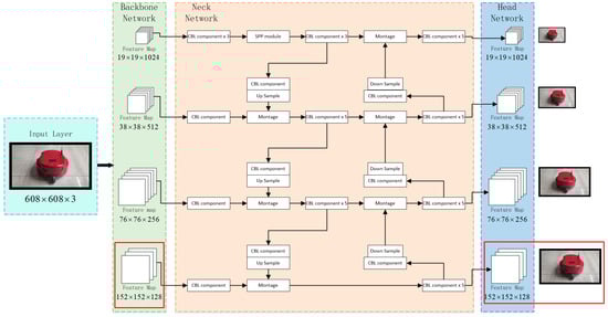 The neck and head networks are utilized to extract fused features more effectively and accomplish multi-size target prediction, including the extraction of center coordinates. To enhance feature extraction and representation, the YOLO algorithm incorporates the PAN (Path Aggregation Network) structure after the Feature Pyramid Network (FPN) for feature fusion across different backbone layers. The neck network ultimately produces three standard-sized feature maps (76 × 76, 38 × 38, and 19 × 19) for multi-scale prediction by the head network. While this algorithm generally achieves good detection accuracy, there is a low probability of false detection in low-light environments or when encountering objects with similar shapes. To address this, we introduce an additional branch with a downsampling rate of 4 (resulting in a 152 × 152 feature map) to the original YOLO algorithm, which already includes downsampling rates of 32, 16, and 8 (corresponding to 19 × 19, 38 × 38, and 76 × 76 feature maps, respectively). This modification enables finer prediction results, enhances detection performance for smaller objects, improves the algorithm’s spatial differentiation capability, and effectively reduces the probability of false detection [].