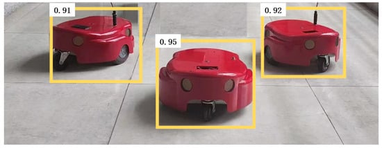 Figure 7 showcases representative detection results achieved by the optimized YOLO target detection algorithm using the constructed dataset. The optimized algorithm demonstrates higher confidence in detecting target robots, road signs, and distinctive shape markers, meeting the accuracy requirements for visual localization.