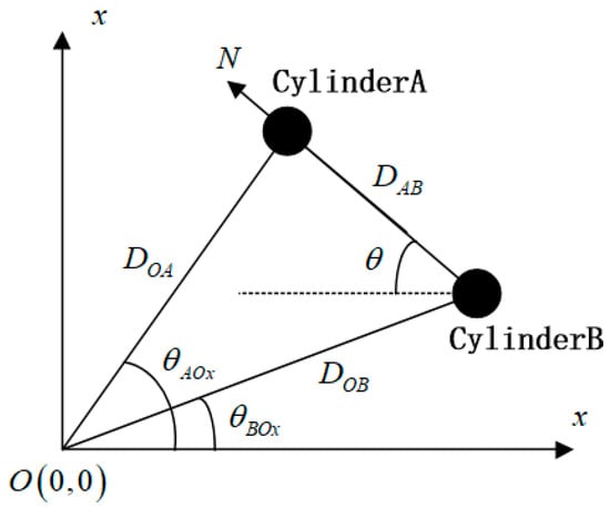 If two colored cylinders are placed in the direction of the member robots’ heading, the distance difference between the two cylinders is obtained by the visual target detection method, and the robot heading can be calculated at this moment. The laser rangefinder positioning heading model is shown in Figure 8.
