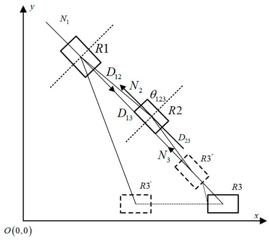 Both visual imaging and laser ranging rely on line-of-sight observations. If the camera–target line is obstructed by other objects, the target cannot be detected and positioning information cannot be obtained. In multi-robot formation movement, the main robot and member robots may be occasionally obstructed by other robots or obstacles. Figure 10 illustrates a scenario where the member robots are obscured by each other. In the figure, R1 represents the main robot; R2 and R3 represent the member robots; and N1 and N2 indicate the headings of R1 and R2, respectively. When all three robots align in a straight line, as shown in the figure, R1 and R3 are obstructed by R2, rendering R3 unobservable by R1.