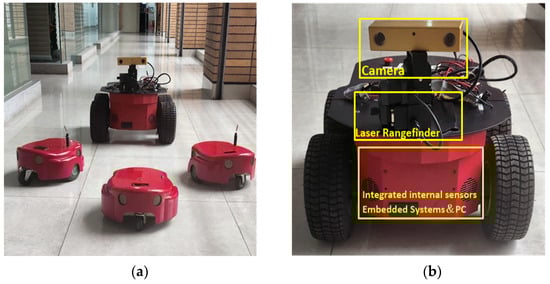 To evaluate the performance of the multi-robot cooperative localization algorithm in an open indoor environment, we designed a multi-robot experimental platform consisting of a main robot and three smaller robots, as shown in Figure 11a.