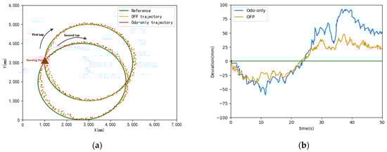 Figure 13 illustrates a graph comparing the data fusion positioning (OFP) using both the odometer and gyroscope with the trajectory deviation of using only the single sensor odometer in the experimental scenario Test Case 1. The results demonstrate that the fused trajectory exhibits greater proximity to the real trajectory compared to that when relying solely on the odometer navigation, resulting in an accuracy improvement of 43.3%.