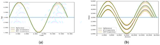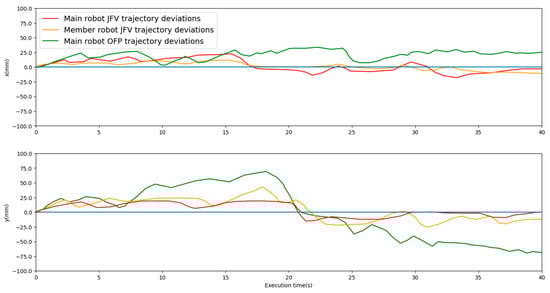 Figure 15 displays the peak curves derived from the trajectory deviations calculated during positioning experiments for both the main robot and the member robots. The JFV trajectory of the main robot exhibits greater accuracy compared with that of the member robots. This can be attributed to the main robot’s self-positioning in the global coordinate system, which experiences fewer observation errors. On the other hand, the global positioning of the member robots incorporates the observation errors of the main robot.