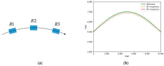 Figure 16 illustrates a scenario where the robot follows a small arc trajectory. R1 represents the main robot, while R2 and R3 are member robots. Throughout the motion, R3 remains obscured by R2 and cannot be observed by R1. The accuracy of R2, which relies on vision and laser navigation, is higher compared with that of R3, which relies on sonar array ranging data.