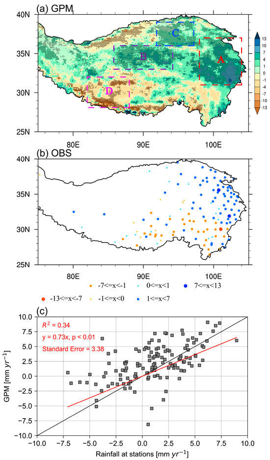 Spatial distributions of the trend in summer total rainfall (STR, mm yr−1) over the Tibetan Plateau (TP) for the period of 2000–2021 based on (a) GPM and (b) station observations, respectively. (c) Comparison of STR trends between GPM and station observations (red line) and the black line presents the 1:1 slope. Dotted areas in (a) represent the significance above the 90% level as estimated using the Student’s t-test. Colored boxes represent the four key regions (A, B, C, and D and the same below) focused on in this study, where rainfall trends are predominantly significant.