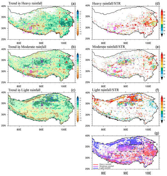 Figure 5a–c show the trends in the proportion of three levels of rainfall intensities to STR in the period of 2000–2021. Clearly, the proportion of heavy rainfall exhibits a consistent increasing trend in the eastern TP (Figure 5a), well consistent with its own trends (Figure 2a). Conversely, the proportion of moderate rainfall demonstrates an opposing trend to that of heavy rainfall over the entire TP (Figure 5b). Additionally, the trend in the proportion of light rainfall weakens in most TP regions, except for region D and north of region B (Figure 5c).