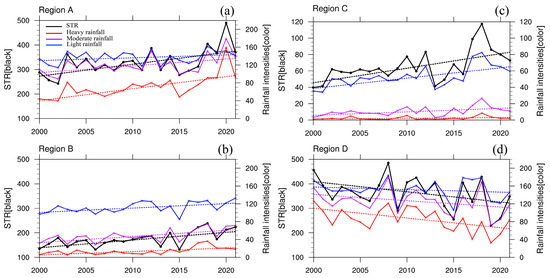Time series of STR (black lines, mm), heavy rainfall (red lines, mm), moderate rainfall (purple lines, mm), and light rainfall (blue lines, mm) averaged over regions (a) A, (b) B, (c) C, and (d) D. The dotted lines represent the trends in each variable during 2000–2020. Left and right axis represent the STR and three levels of rainfall intensities, respectively.