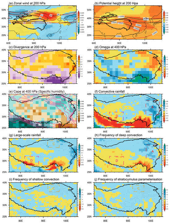 Spatial distribution of the linear trends in (a) zonal wind (shaded, m s−1 yr−1), (b) potential height (shaded, gpm yr−1), and (c) divergence (10–9 s−1 yr−1) at 200 hPa. The black contours in (a) and (b) represent the averaged zonal wind and potential height for the first 5 years from 2000 to 2004, while the red contours are the last 5 years from 2017 to 2021, respectively. Panels (d,e) show vertical velocity (10–5 Pa s−1 yr−1) and convective available potential energy (CAPE) (shaded, J kg–1 yr−1) at 400 hPa, and vertical integrated specific humidity (contours, 10–5 kg kg−1 yr−1) during 2000–2021, respectively. Trends in (f) convective rainfall (mm yr−1), (g) large-scale rainfall (mm yr−1), the frequency (% yr−1) of (h) deep convection and (i) shallow convection, and (j) stratocumulus parameterization during the period of 2000–2021 are also shown. The dotted areas represent significant values above the 90% confidence level.