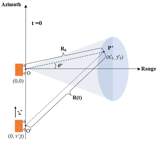 Through the introduction of the relative speed transformation relationship, the moving target can be treated as a stationary target if the platform is assumed to move with the difference velocity of the initial platform velocity and the target velocity [25]. At this time, the coordinates of the platform are changed from to . The moving target rotates to , and its coordinates are changed from to .