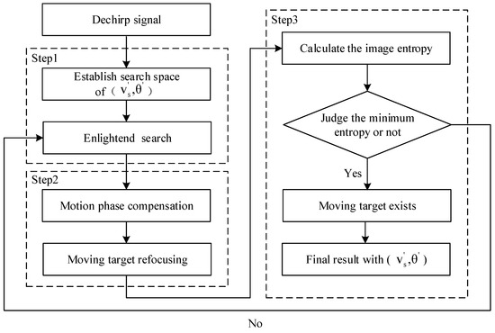 The flowchart of our proposed detection method is presented in Figure 3, which consists of three steps. (1) The 2D parameter search space is first established. The optimal 2D parameters are searched using the enlightend search. (2) In each parameter search loop, the modified Range Doppler (RD) algorithm is used to refocus the input data by the motion phase compensation. (3) Following the phase compensation under different groups of , the entropy value of each refocused image is calculated. By determining if the minimum entropy of the refocused image converges towards a set of , the presence of the moving target within the scene can be judged.