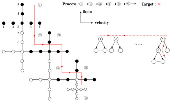 We used a strategy similar to the enlightend search presented in [36]. Its searching process diagram is shown in Figure 4. A two-dimensional parameter search space is established first by designing “cross”. The “cross” can be designed by determining the initial node and the search step. The efficiency of the search process is impacted by the position of the initial node. The initial node is usually set according to the speed and position of the platform at .