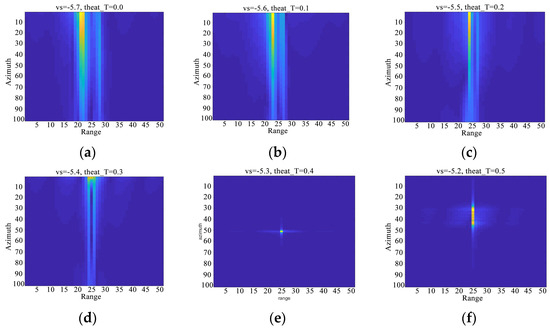 Equation (6) represents the focusing equation. The moving target can be refocused by searching the radar velocity and the squint angle and applying corresponding phase compensation to the moving target signal based on these parameters [27]. For different point targets in the scene, the matched values of and are different. Hence, the algorithm searches target by target in the 2D parameter space to get the matched parameters for refocusing.