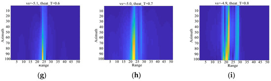 First, we use the traversal method to search the parameters of T1. To search the optimal parameter of , we conduct a cyclic search ranging from −6 m/s to 6 m/s with a step size of 0.1 m/s. Similarly, for parameter , we perform a cyclic search from −6° to 6° with a step size of 0.1°. The refocusing results for different parameters during the search process are shown in Figure 7. Subfigures (a–i) are the images under different sets of . The entropy of the image under different parameters is calculated, and the optimal parameters that achieve refocusing of the moving target are confirmed by the minimum entropy principle.