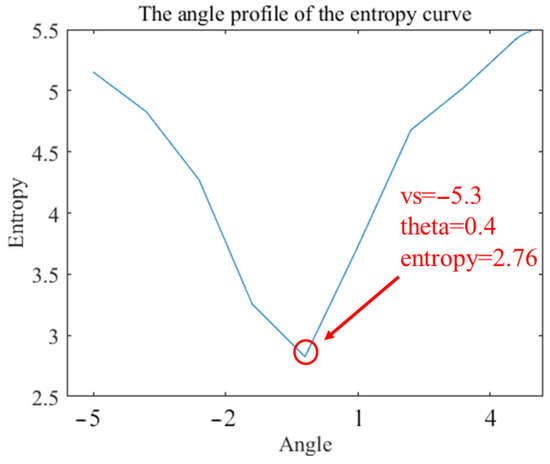 Figure 9 is the result of the angle profile. This profile can reflect the relationship between the image’s entropy and its angle during the parameter search process. It can be seen that when the angle is 0.4°, the entropy of the refocused image reaches its minimum value. Figure 10 is the result of the velocity profile. This profile demonstrates the relationship between the image entropy and the velocity during the parameter search process. This figure clearly illustrates that the minimum value of the entropy for the refocused image is achieved at a velocity of −5.3 m/s. It can be observed from Figure 9 and Figure 10 that when the parameters = −5.3 m/s and = 0.4° are used to refocus T1, the refocusing image reaches the minimum entropy value of 2.76.