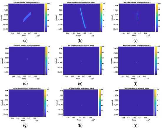 The theoretical value and the search results under each iteration of T1 are shown in Table 3. The refocusing results of moving target T1 under nine iterations are shown in Figure 12. Due to the utilization of a larger search step size in the first three iterations, there is a deviation between the results of the first three iterations and the theoretical optimal parameter values. When the first three sets of parameters are used to refocus the moving target, the point target still remains in the defocused state. Therefore, it can be observed from the entropy curve that the entropy of the moving target image has a significant variation during the first three iterations. With the increase in the number of iterations, the search step is gradually halved, and then the optimal parameters are searched in depth. This process makes the searched results match closely with the theoretical values, thereby leading to small variations observed on the entropy curve.