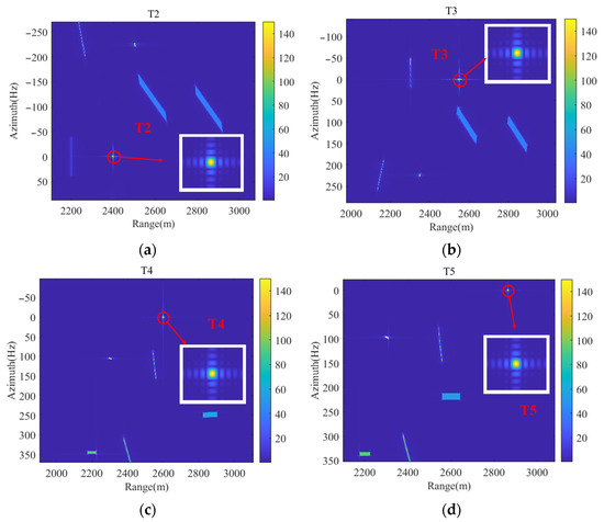 When , moving target T1 has the 2D velocity with 2 m/s and 5 m/s. And it is located at (2300, 100). The positions of T2 and T3 are (2400 m, 0 m) and (2500 m, 500 m), respectively. The velocities of them are 0 m/s and 10 m/s. The moving targets T4 and T5 are located at (2600, 0) and (2800, 600), respectively, and the velocities of them are 10 m/s and 0 m/s. The coordinates of S1 in the scene are (2200 m, 0). As can be seen from Figure 6, after GBSAR imaging, S1 is well focused. Due to the influence of velocity, the moving targets are defocused and displaced.