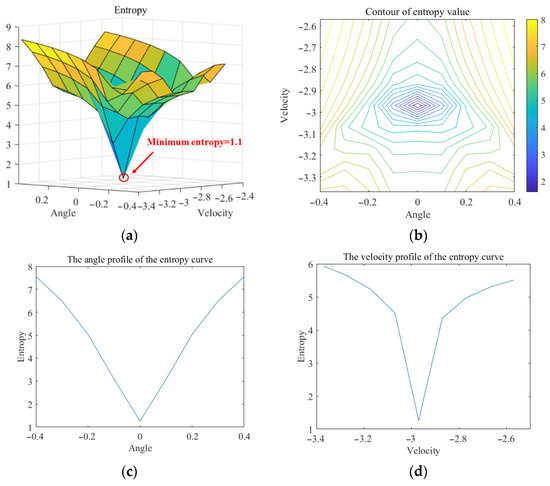 Next, the enlightend search is used to search the parameters of T1. According to the platform velocity of this simulation, we set the initial node at (0, 0.03). The 2D parameter space is established for searching with 2 m/s and 0.1 ° as the step sizes of the velocity dimension and angle dimension, respectively. It is worth mentioning that the search strategies of the traversal method and the 2D enlightend search are different. The traversal method always maintains a fixed step size to indiscriminately search for and . For the enlightend search, the node with a minimum entropy is always located at the interior of the “cross.” In order to search in depth, the search step size will be halved as the number of iterations increases. Therefore, the search step size is not the reference for comparing the convergence time between the two methods. In this study, the computational efficiency of the two methods is judged through the comparison of the time spent searching for similar optimal values in the range of allowable error.