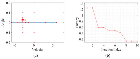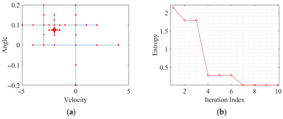 The process of using enlightend search to find the optimal parameter for A3 is shown in Figure 17a. The different nodes in the search “cross” are represented by red “*”. The relationship between the number of iterations and the 2D entropy is shown in Figure 17b. The circles represent the minimum entropy value after each iteration. A clear trend can be observed, where the entropy value decreases as the number of iterations increases. And the minimum entropy finally converges to = −3.01 m/s, = 0.03°.