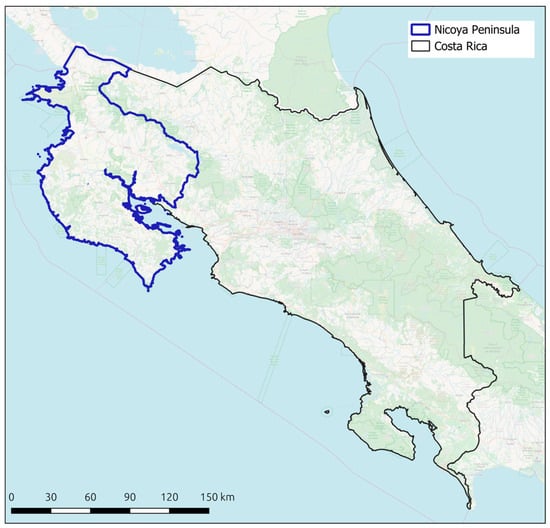 Map of study area. The black line is the Costa Rica boundary and the blue line is the Nicoya Peninsula boundary.