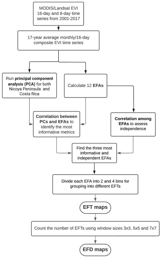 EFTs were derived based on the seasonal dynamics of carbon gains following Alcaraz-Segura et al. []. This approach includes five steps to derive EFTs (Figure 2): (1) principal components analysis, (2) calculating ecosystem functional attributes, (3) auto-correlation testing, (4) correlation between principal components and functional attributes to select the most predictive attributes, and (5) binning the functional attributes to develop an EFT classification. EFD Is then calculated using a moving window approach across the EFT map (see Cazorla et al. [] for further details).