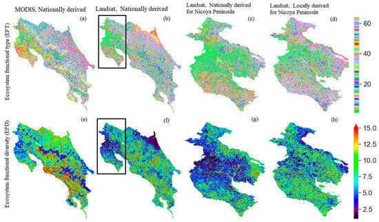 The sensor used to derive EFTs generated differences in the pattern of EFTs across Costa Rica (Figure 3a,b). The MODIS-derived EFTs map has dominant functional types shown in pink in Limón located in eastern Costa Rica while in the same province Landsat-derived EFT maps showed much more mixed types including in red, yellow, and pink. In the western portion of the country, particularly in Puntarenas, it also showed a very different EFTs pattern as MODIS-derived EFTs map showed the dominant types in yellow but Landsat-derived EFTs showed mixed types including in green, blue, and pink. In the center of the country, e.g., San José, the Landsat-derived EFT map has dominant types shown in blue that MODIS is missing. Overall, Landsat-derived EFTs showed greater granularity than those derived from MODIS.