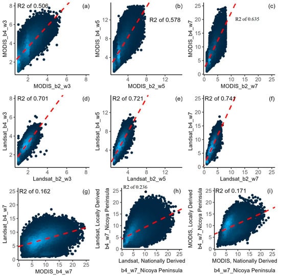 Comparison of Ecosystem Functional Diversity (EFD) calculated using different methods to derive Ecosystem Functional Type (EFT). Methods to derive EFT were based on dividing the functional variables into 2 (b2) vs. 4 (b4) bins, using different window sizes to count the number of functional types, either 3 × 3 (w3), 5 × 5 (w5), or 7 × 7 (w7) pixels. The top two rows show comparisons of EFD using EFTs derived from MODIS (a–c), and Landsat (d–f) at national scales. Comparison between MODIS and Landsat-based EFD (g) at the national scale are shown for the method of 4 bins and a window size of 7, as this had the highest coefficient of determination (R2); all other MODIS vs. Landsat comparisons can be found in the Supplemental Materials in Figure S6. Comparison of EFD for EFTs derived at the local (Nicoya Peninsula) scale vs. the national (Costa Rica) scale ((h) based on Landsat and (i) based on MODIS) is likewise only shown for 4 bins, with a window size of 7; all other comparisons can be found in Supplemental Figure S8. Red dashed line represents a linear trend.