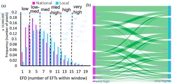 Figure 5 shows that the values of EFD derived at the local scale are higher than when derived at the national scale. The number of pixels with higher diversity starting from a medium level at a local scale is higher than those extracted at a national scale (shown for Landsat-derived EFD; Figure 5a). The diversity levels derived at the smaller spatial extent appear to be nested within the diversity levels derived at a larger extent, with most pixels categorized as low diversity corresponding to low-medium or medium diversity pixels at a local scale, and many low-medium pixels nationally corresponding to medium and medium-high pixels locally (Figure 5b).