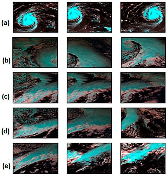 Inter-class similarity: (a) tropical cyclone (b) extra-tropical cyclone (c) high ice cloud. images from (a–c) all have blue hues and the (d) frontal surface (e) westerly jet has a bluish cyclonic curve with elongated cloud belts.