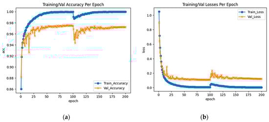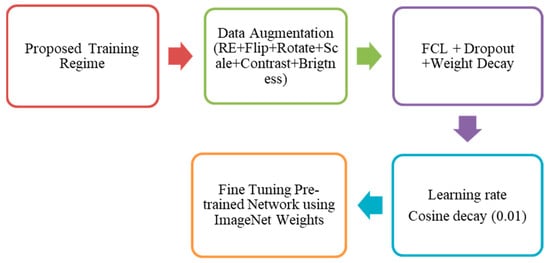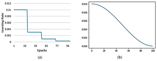 The learning rate is one of the crucial hyperparameters and can affect the model’s accuracy to the greatest degree. Initially, a fixed value (0.001) of the learning rate is considered to train ResNet50. From the literature on deep learning, it was observed that a scheduled learning rate performs better than a fixed value. The basic idea is to start the training process with higher learning rates so that the optimizer can move more quickly toward the global minimum. As training progresses, the learning rate values gradually decrease to allow the optimizer to move smoothly toward the target without exceeding the minimum. The step decay plan and the outperforming cosine annealing schedule were also tested as shown in Figure 4. Following a predetermined timetable, the learning rate is reduced in the step decay after a number of epochs. The cosine annealing schedule, on the other hand, follows a cosine curve for each epoch.