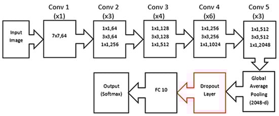 The existence of BN layers in the ResNet design has previously been covered in great depth. There is no need to include dropout layers in the convolutional portion of the network since BN offers a regularization effect that is comparable to that of dropout in addition to a number of additional benefits [40]. Dropouts are often employed in the FCL section of networks; however, the ResNet50 design under consideration does not include an FC layer that is suitable for dropout coupling. The only place for dropout (in red) is immediately following the GAP layer, as shown in Figure 5. A detailed examination of the outcomes showed that, while employing dropout to probabilistically drop the GAP layer output, we permanently lost several inputs that were essential to the network’s capacity for feature discrimination. Each node in the GAP layer contains distinct feature data that were taken from the last convolution block’s activation maps. Therefore, the only feasible way to deploy a dropout approach was to change the existing design by adding an additional completely linked layer that would act as a foundation.